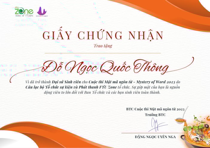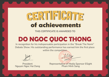 Là người dẫn chương trình, tôi đã đóng góp vào sự thành công của chương trình "Intergenerational Learning Culture" tại English Camp bằng cách tạo ra một môi trường học tập tích cực và đầy đủ sự đa dạng để học sinh trung học có thể tương tác với người lớn thuộc các độ tuổi khác nhau. Tôi khuyến khích sự tham gia và sự hợp tác, và hỗ trợ các hoạt động hấp dẫn để thúc đẩy học sinh sử dụng tiếng Anh của mình một cách thực tế và có ý nghĩa. Bằng cách tạo ra một chương trình động và tương tác, tôi giúp tạo ra một tình yêu với việc học tập và một cảm giác cộng đồng trong tất cả các học viên tham gia.